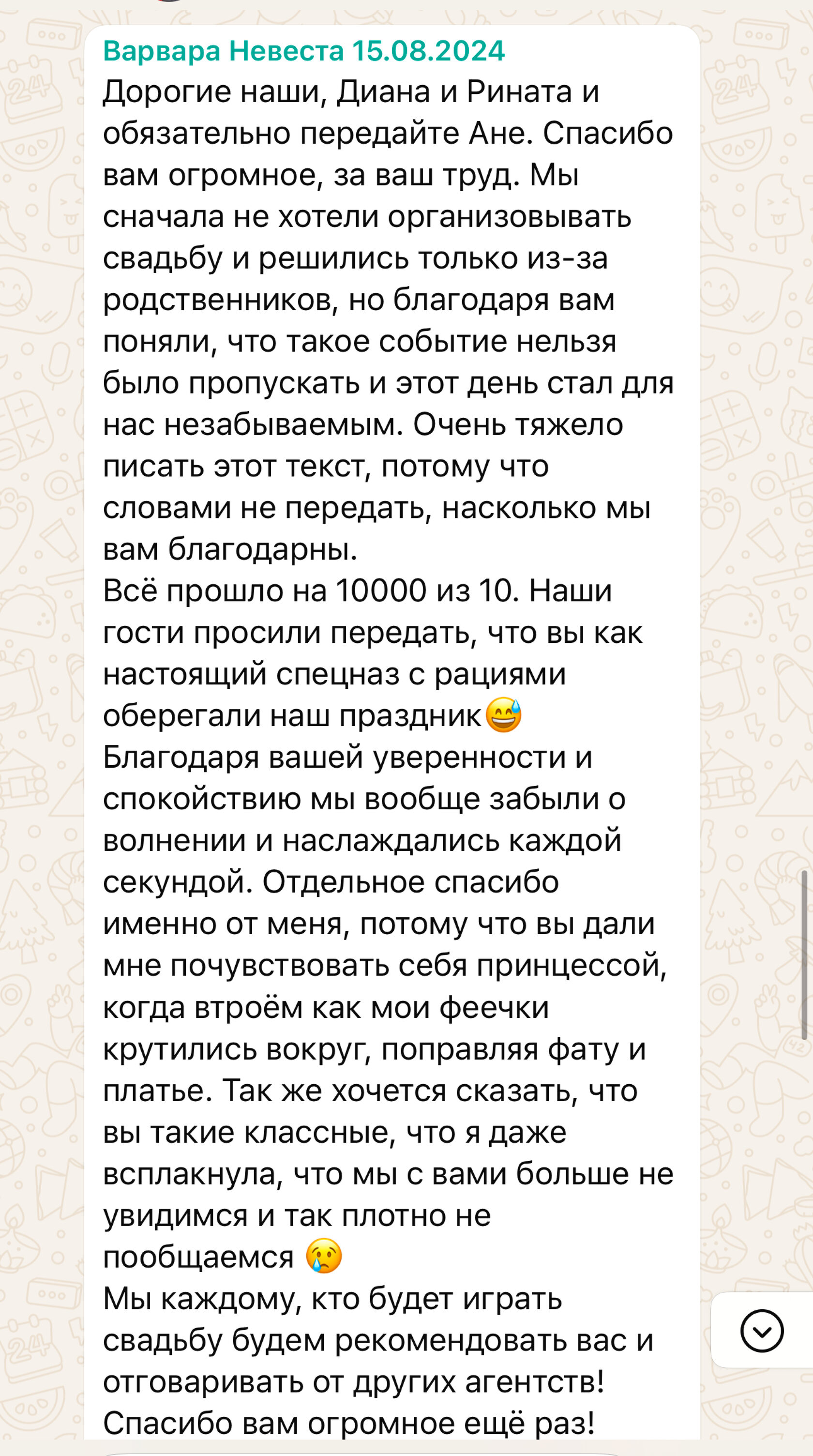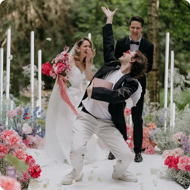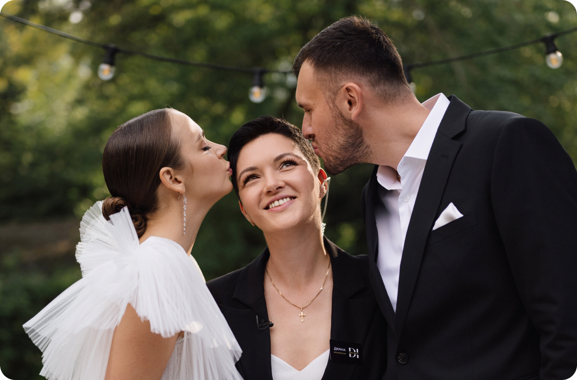 Каждая пара уникальна. Поэтому мы тщательно подбираем специалистов, которые вместе с Вами создадут мероприятие по духу, формату и атмосфере подходящее именно Вам. При подборе, что немаловажно, учитываем совпадение клиента и специалиста по ценностям, внутренним мотивам.